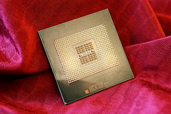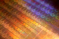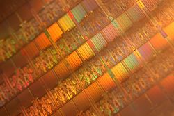 Shown is a closeup of a wafer containing Intel Corporation's new Quad-Core Xeon 7300 series processors, September 5, 2007, at a news conference in San Francisco. Designed for multi-processor enterprise servers, the new 7300 processors can deliver up to twice the performance and more than three times the performance per watt over the company's previous generation dual-core products. (Photo for Intel by Court Mast, Mast Photography, Inc., San Francisco)