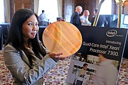 A model displays a wafer containing hundreds of Intel's new Quad-Core Xeon 7300 series processors, September 5, 2007, at a news conference in San Francisco. Designed for multi-processor enterprise servers, the new 7300 processors can deliver up to twice the performance and more than three times the performance per watt over the company's previous generation dual-core products. (Photo for Intel by Court Mast, Mast Photography, Inc., San Francisco)